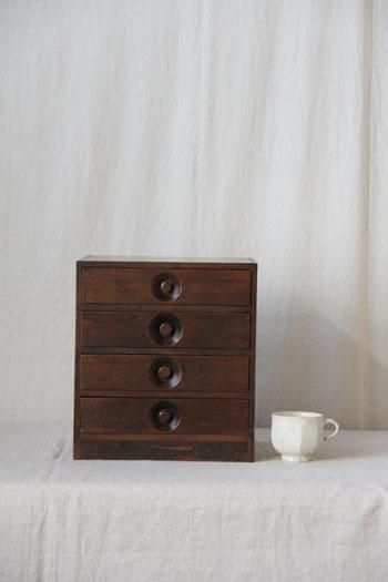濃いめの色合いと取っ手のデザインがきれいな小引き出し箱。