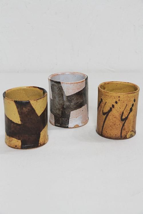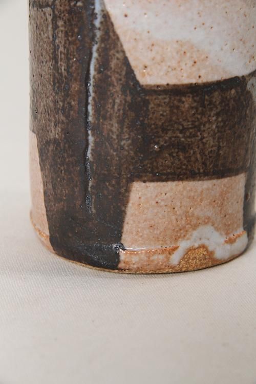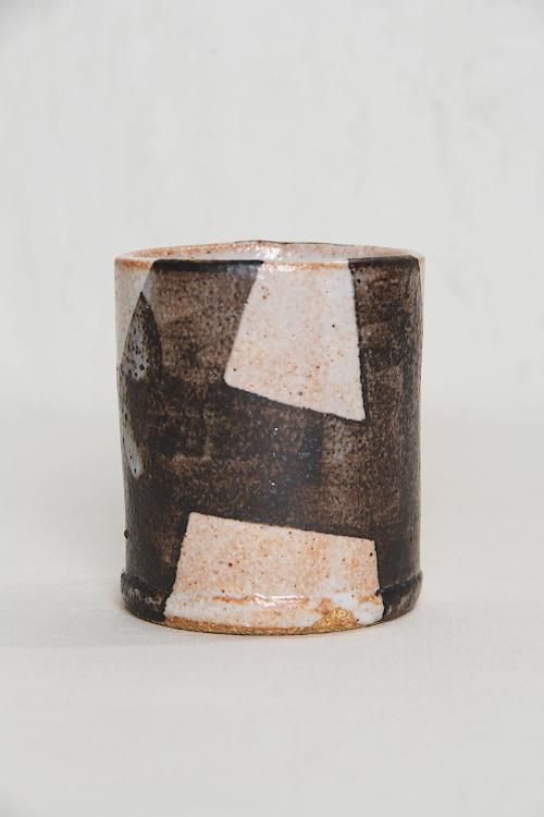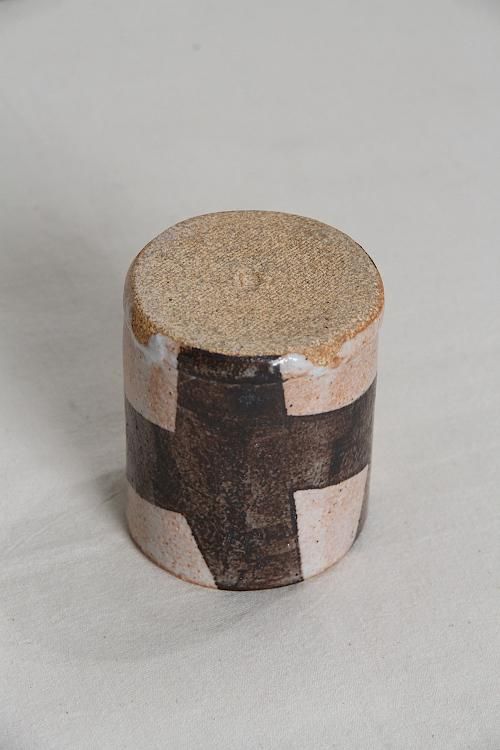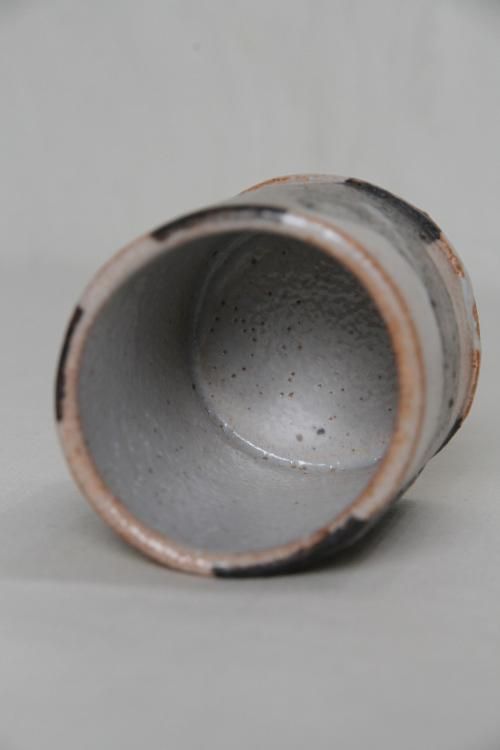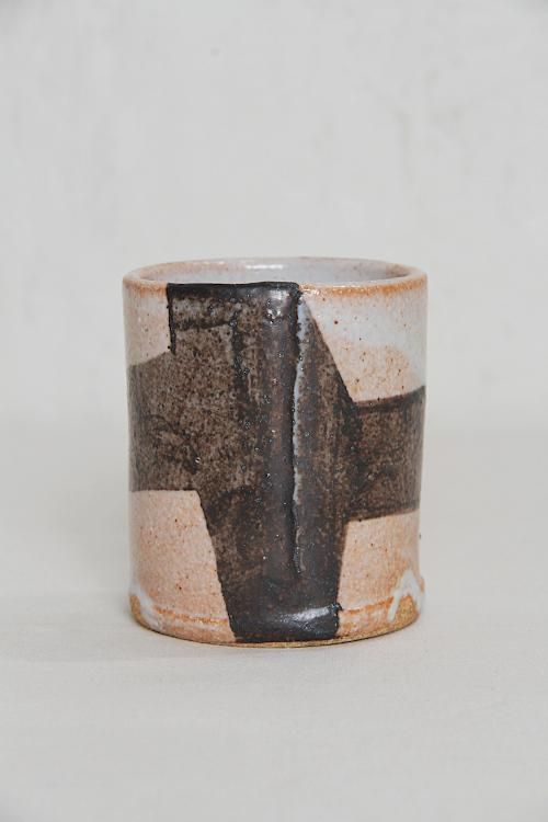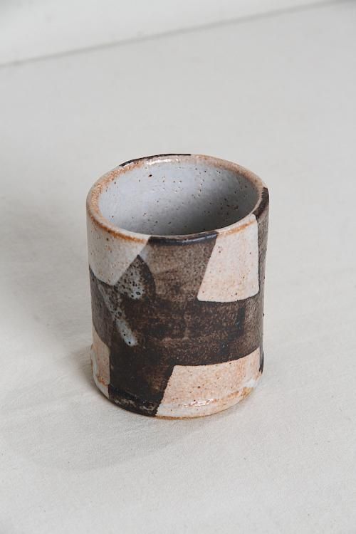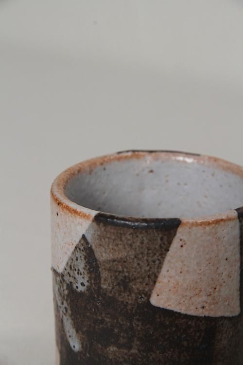 真っ白ではない少しピンクがかったきれいな白釉に、大胆な格子の文様が入った湯呑。