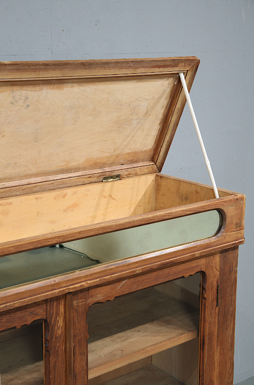 全面上部に横長のミラーがあり裏側は収納にしても良いですし、天板の裏側にポップを貼って陳列棚としても使えます。